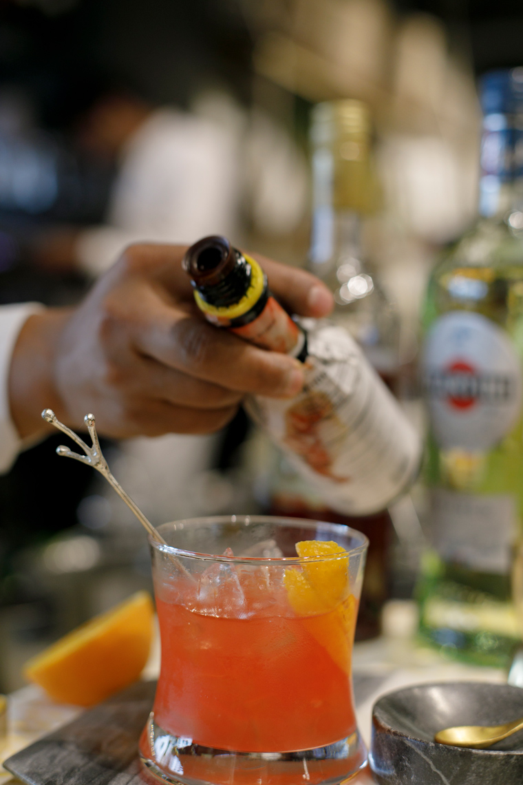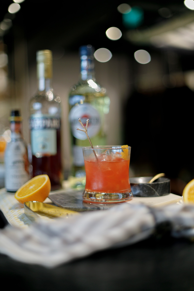 - Pour Campari, Martini Bianco, fresh orange juice and orange bitters on ice in an old fashioned glass.