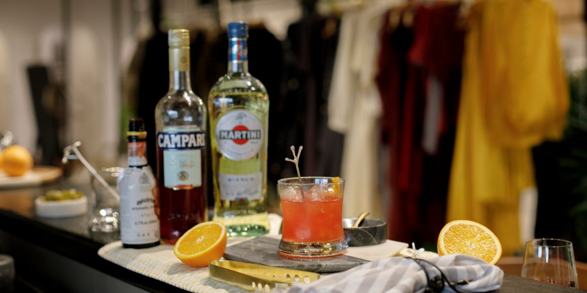 - Pour Campari, Martini Bianco, fresh orange juice and orange bitters on ice in an old fashioned glass.