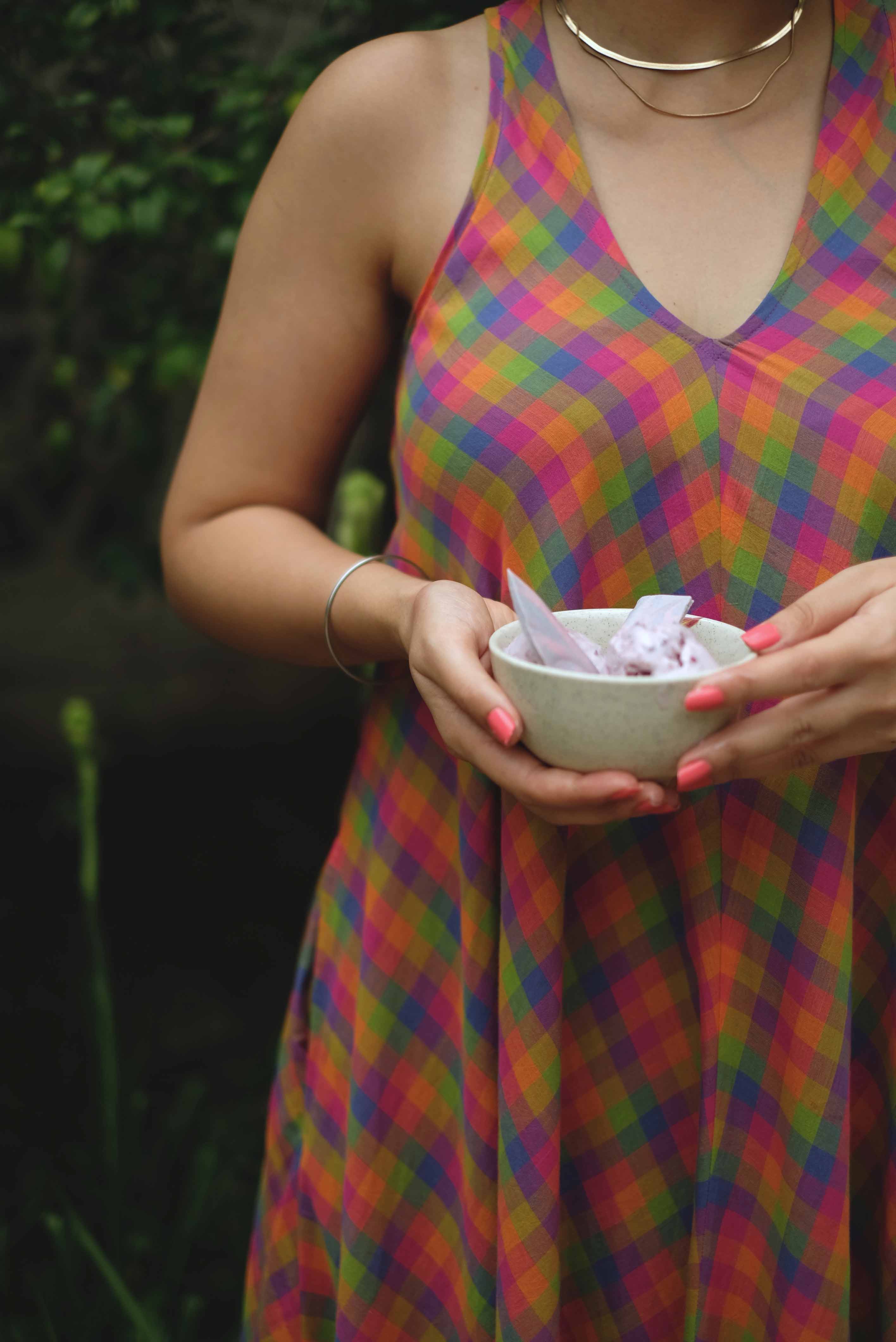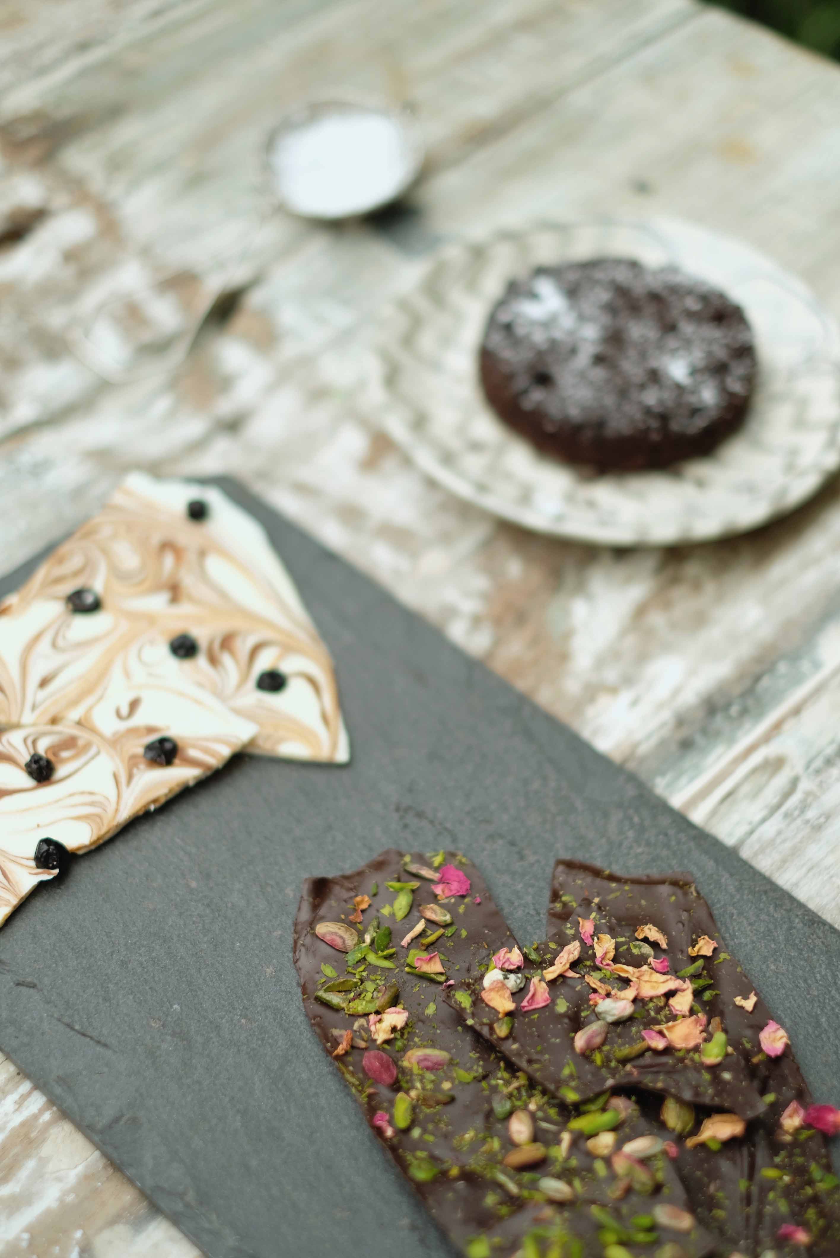 For her shoot with us, she brought a dark chocolate and a delightful blueberry raspberry ice cream that ran fluid from the spoon; a very special Nicobar-tribute dessert that harnessed a tropical fresh vibe…a coconut ice cream sprinkled with toasted coconut that smelt wonderful and left a nutty aftertaste. “It’s a slow process of steeping fresh roasted coconut in the crème anglaise for hours, then heating, cooling and churning, so it packs as much flavour as possible,” she told us. She also brought an assortment of her barks (rose & pistachio, white chocolate with berry swirls, milk chocolate with cookie dust, and white chocolate with coffee and blueberries), and a melt-in-the-mouth mixed berry white chocolate ganache pie, and a bitter chocolate tea cake. All wonderful, and deliciously homemade, and all very us (even if we do say so ourselves).