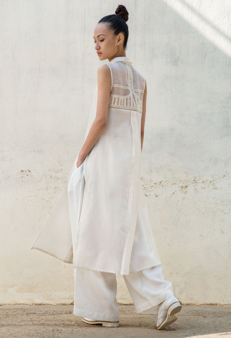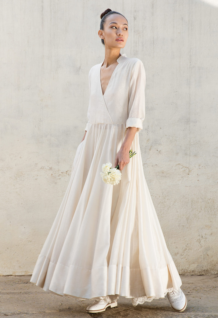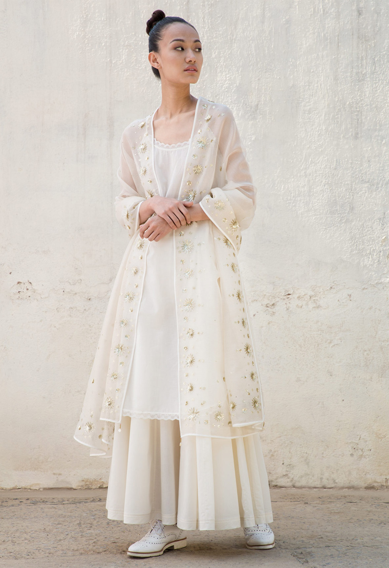 Chanderi is very Indian in its appeal, but for Sitth we’ve played with plenty of ‘western’ silhouettes. You’ll find slips and overlays, dresses and jackets—all kitted out in this silken fabric. You’ll also notice little pops of embroidery and also the lace which adds a feminine accent to these dreamy, voluminous silhouettes.