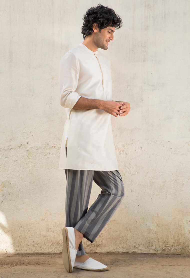 Chanderi is produced by weaving silk into the traditional cotton yarn. The fabric we used for Sitth is 60 gram fine chanderi, which is prepared with 70% cotton and 30% silk. We’re big fans of its sheen and sheerness, so it’s no surprise that we’ve worked with this fabric collection after collection. “I love its fall and the way it drapes. It is subtle, and yet very structured,” the collection’s designer, Aparna Chandra, said.