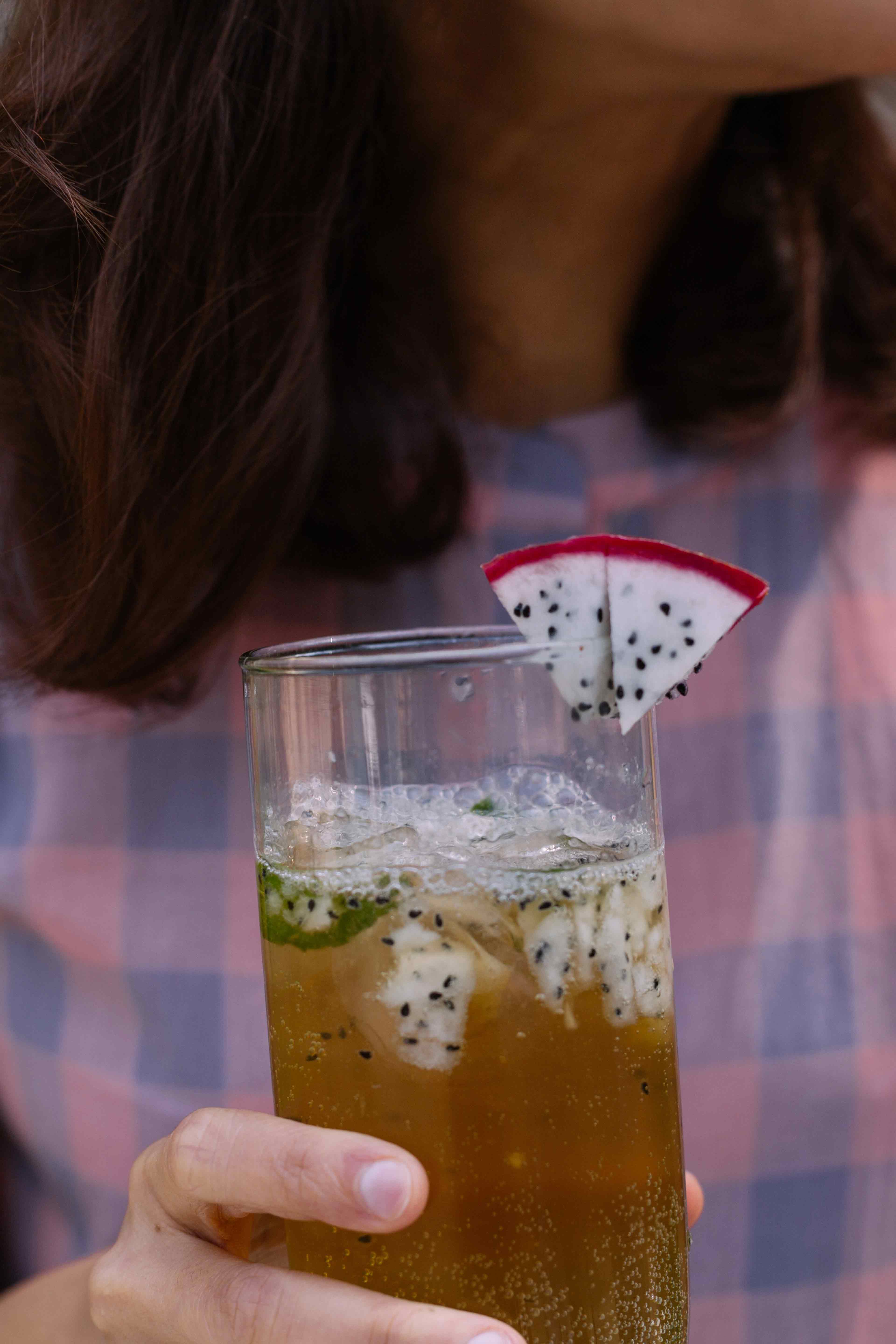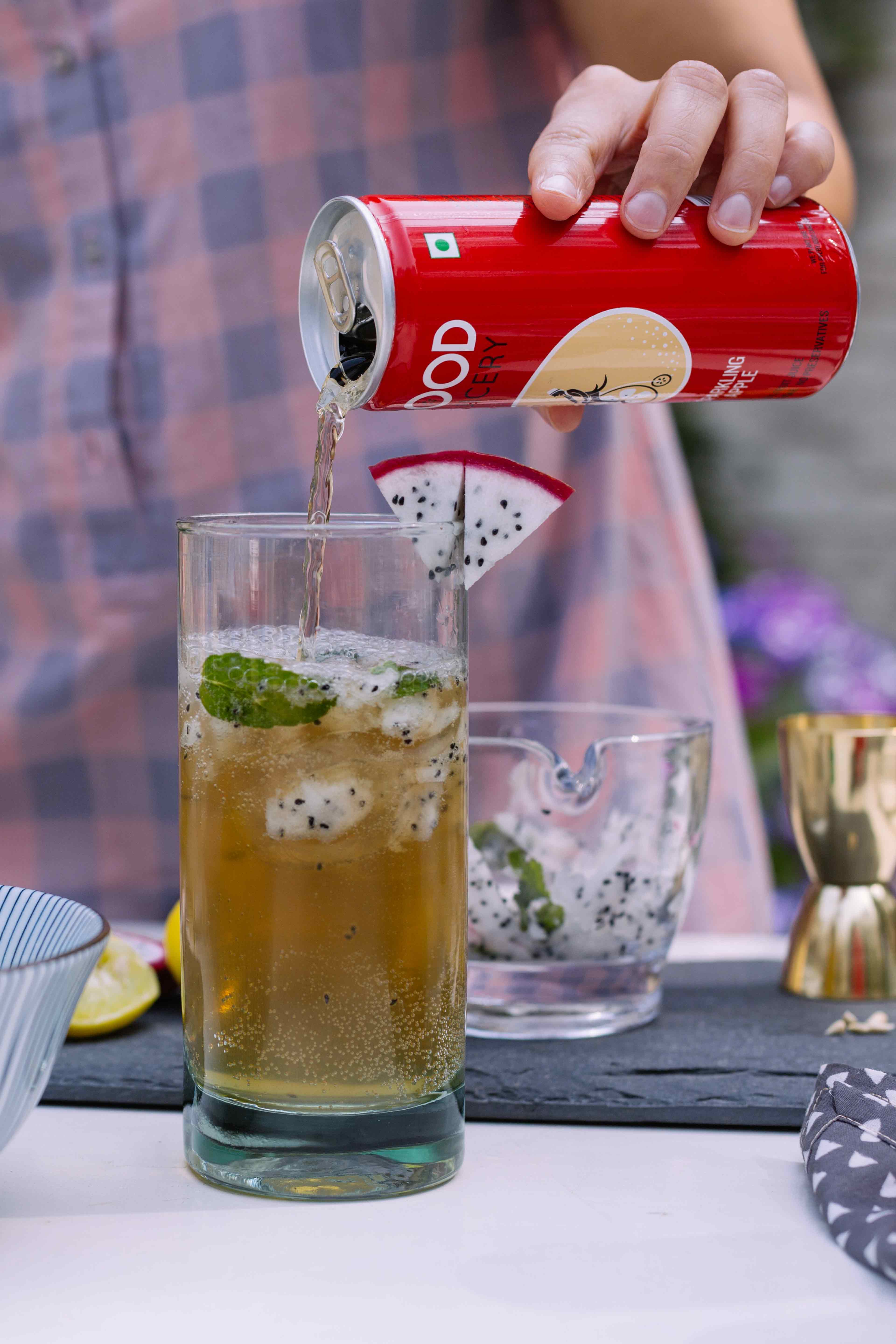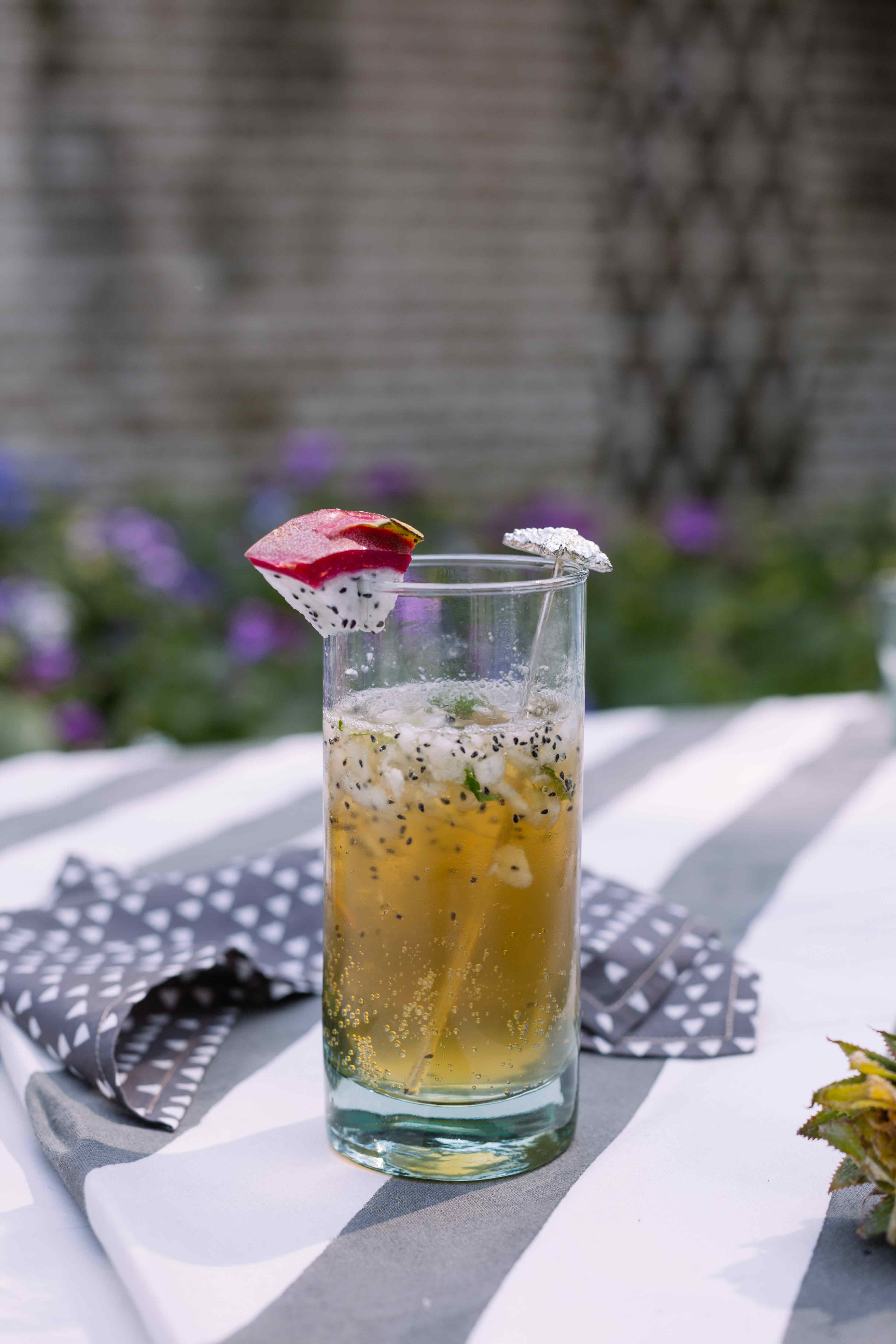 Dice a medium-sized dragonfruit and set it aside. Wedge the rim of a highball glass with muddled dragon fruit and throw in the rum, mint leaves, diced dragonfruit, lemon juice and ice. Top it off with a can of sparkling apple juice from Good Juicery and you’re golden. Chin chin!