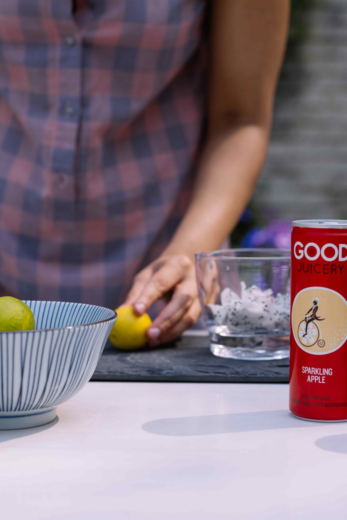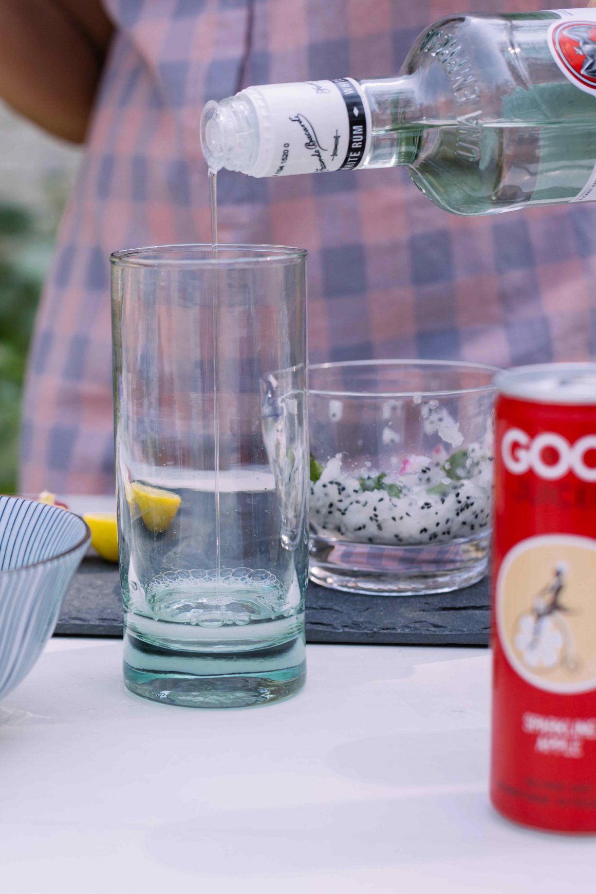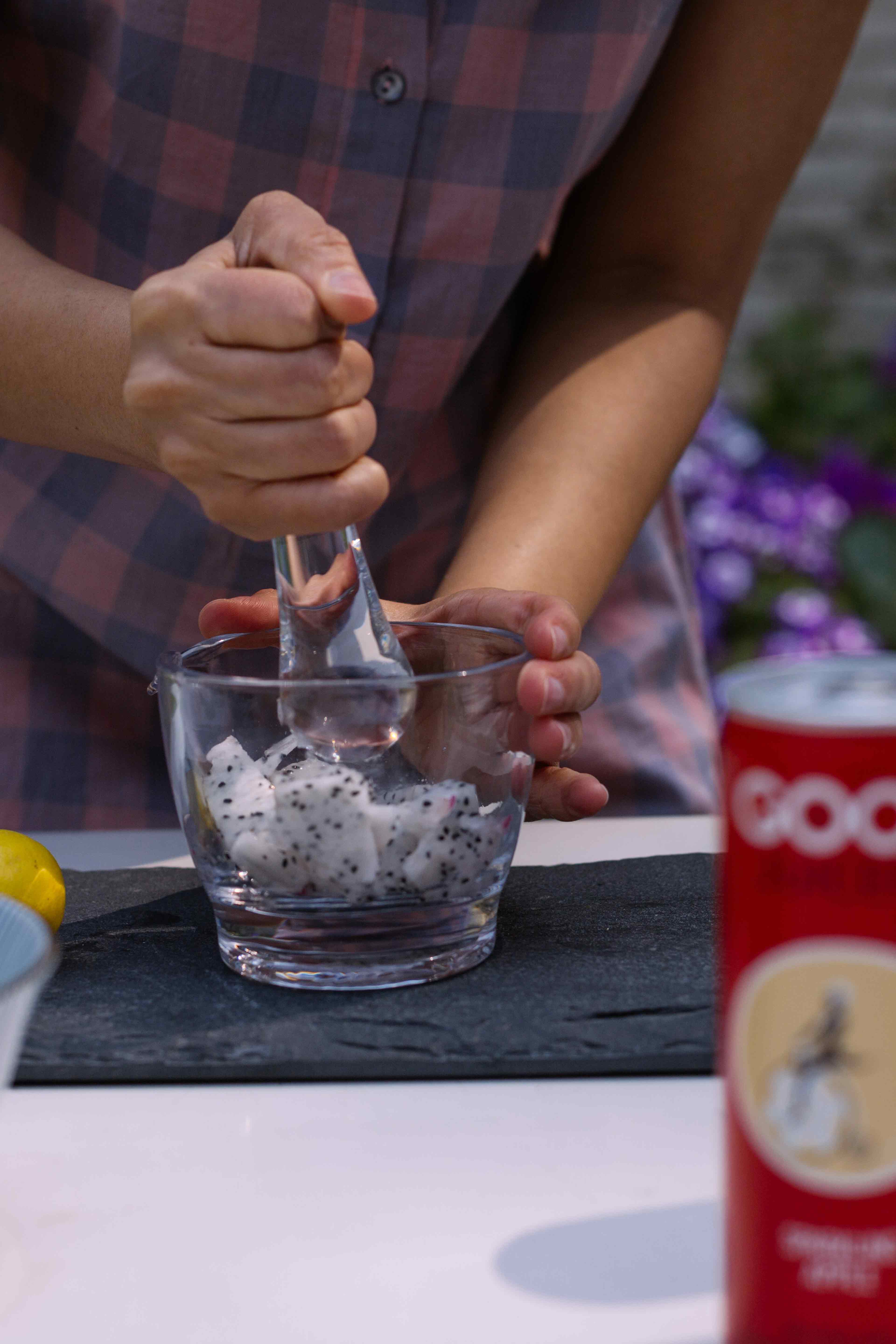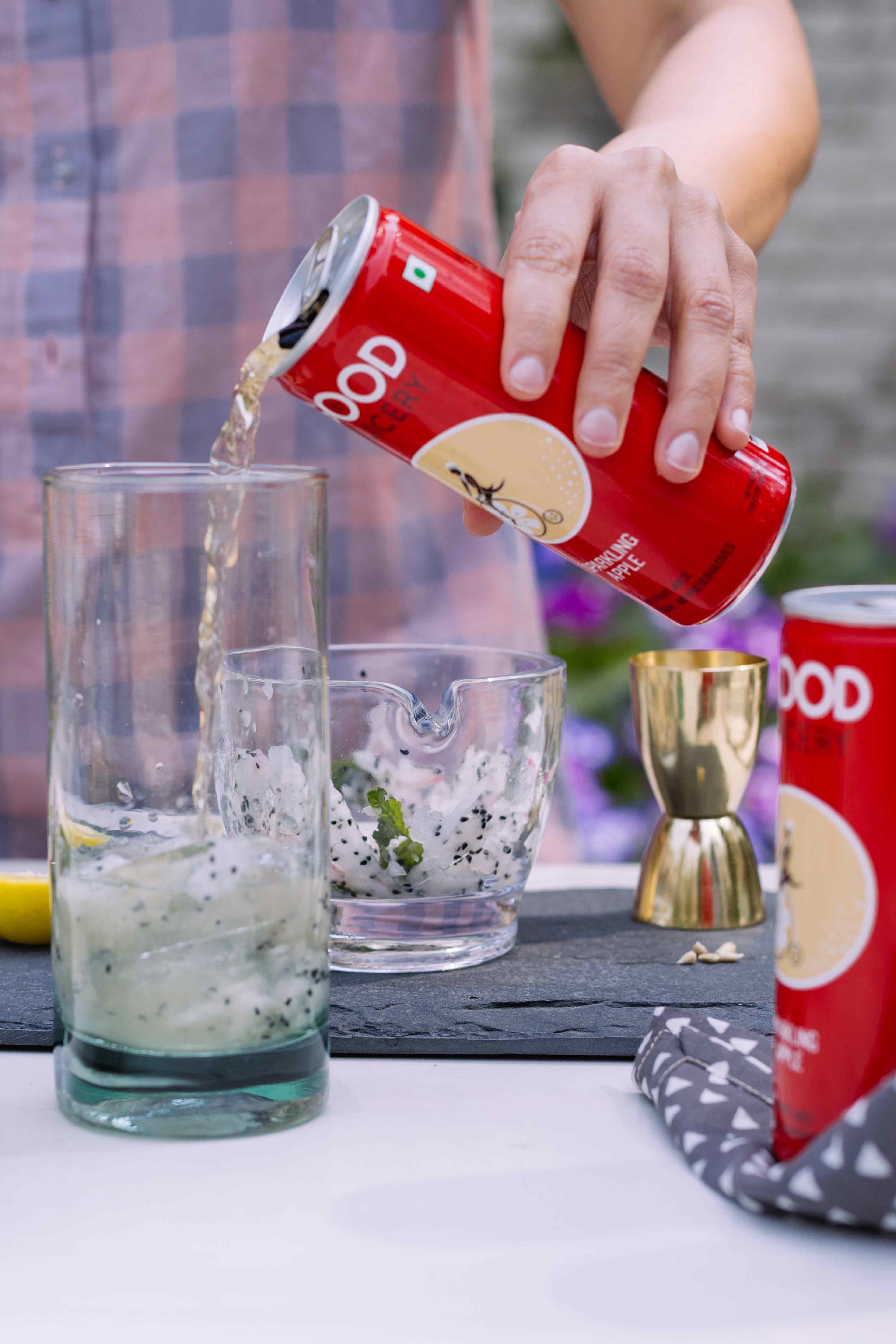 Dice a medium-sized dragonfruit and set it aside. Wedge the rim of a highball glass with muddled dragon fruit and throw in the rum, mint leaves, diced dragonfruit, lemon juice and ice. Top it off with a can of sparkling apple juice from Good Juicery and you’re golden. Chin chin!