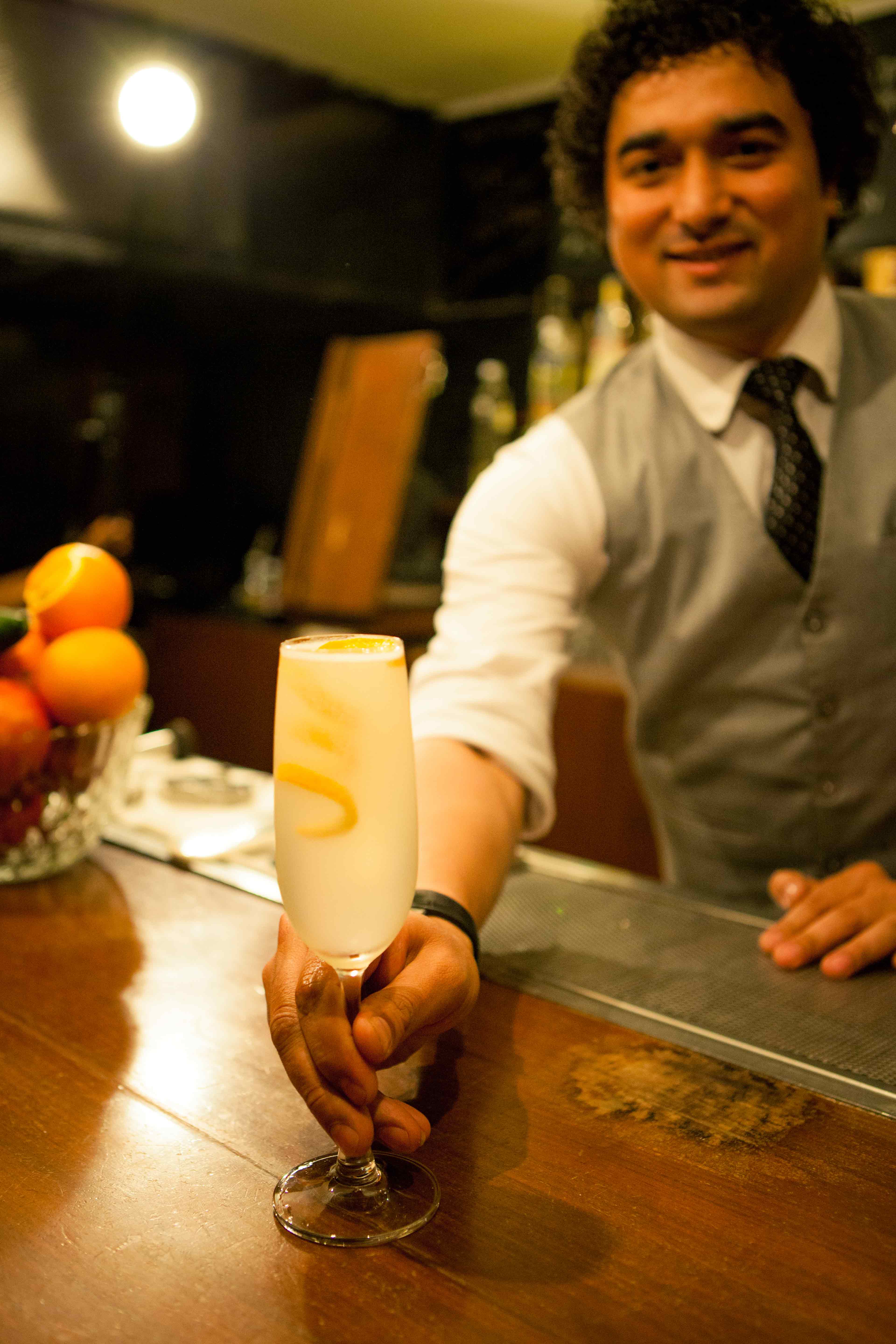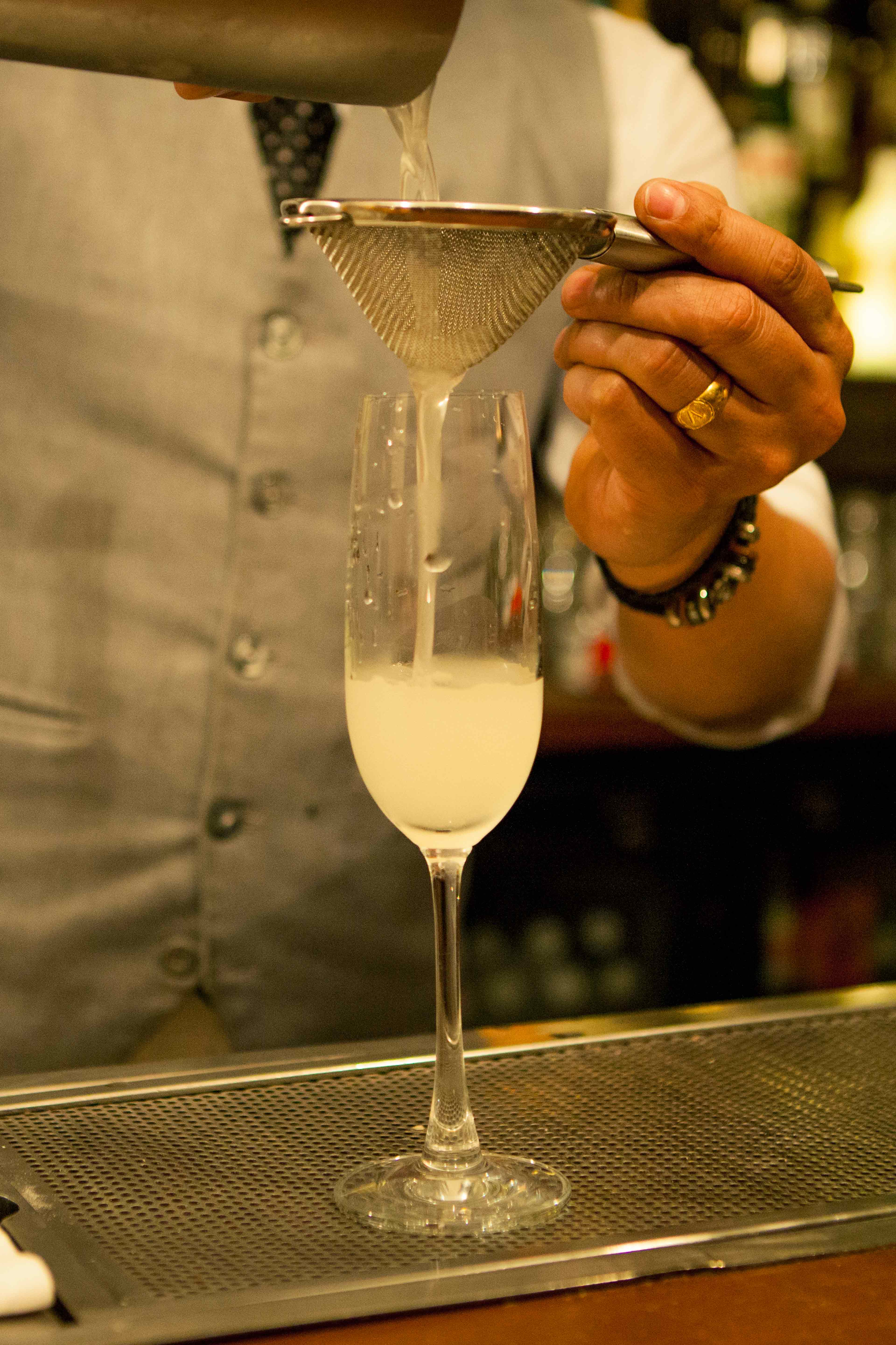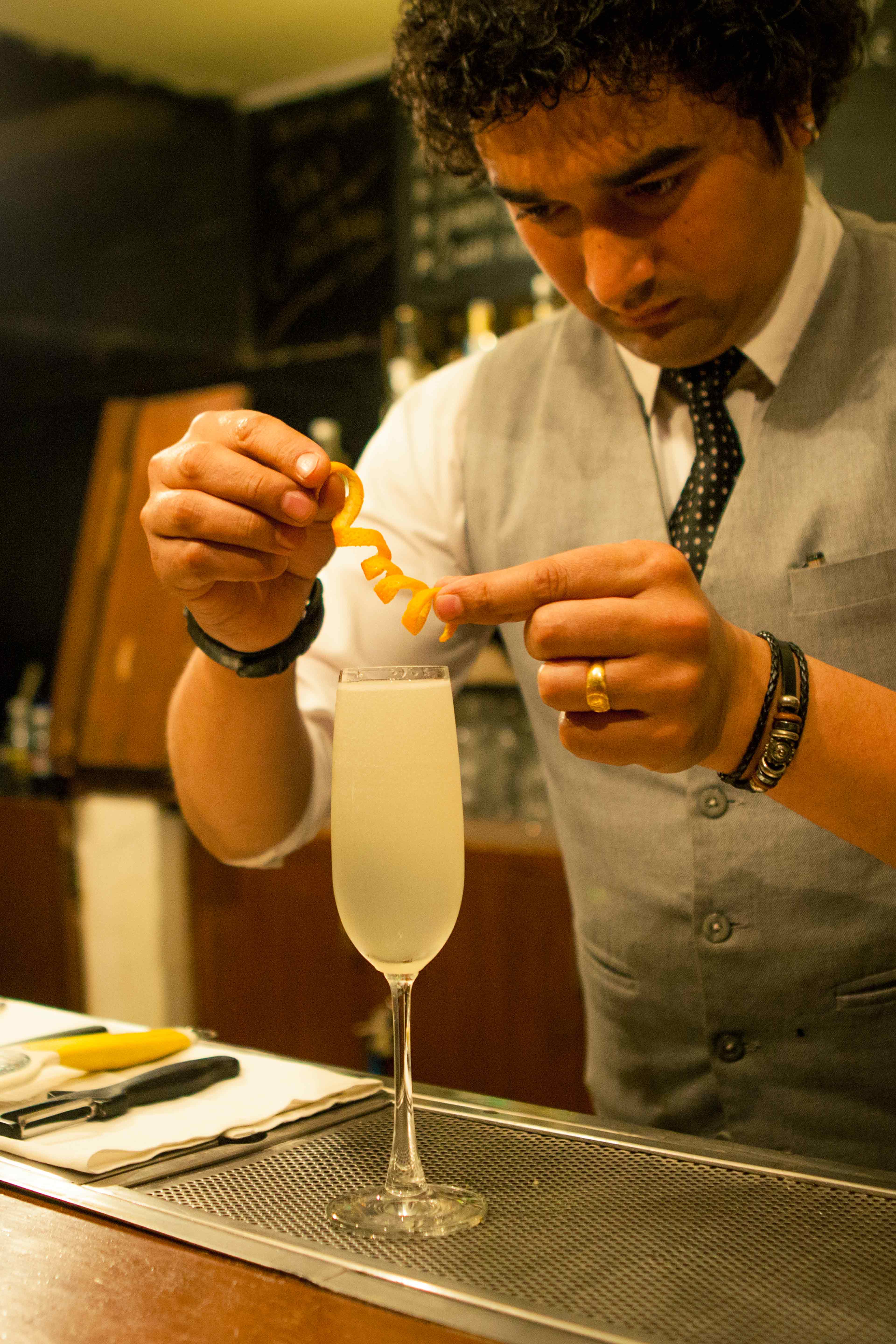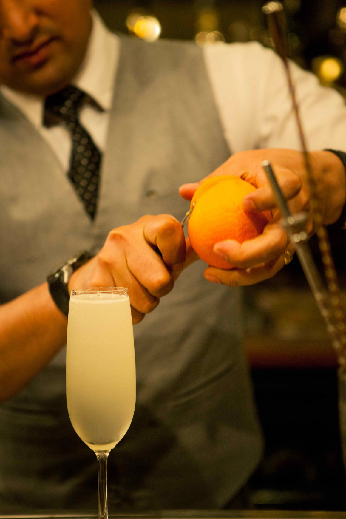 Mix it all together, shake well, and pour it into a champagne flute. Garnish with a wafer-thin oval of citrus peel (twist, for extra prettiness). Cheers!