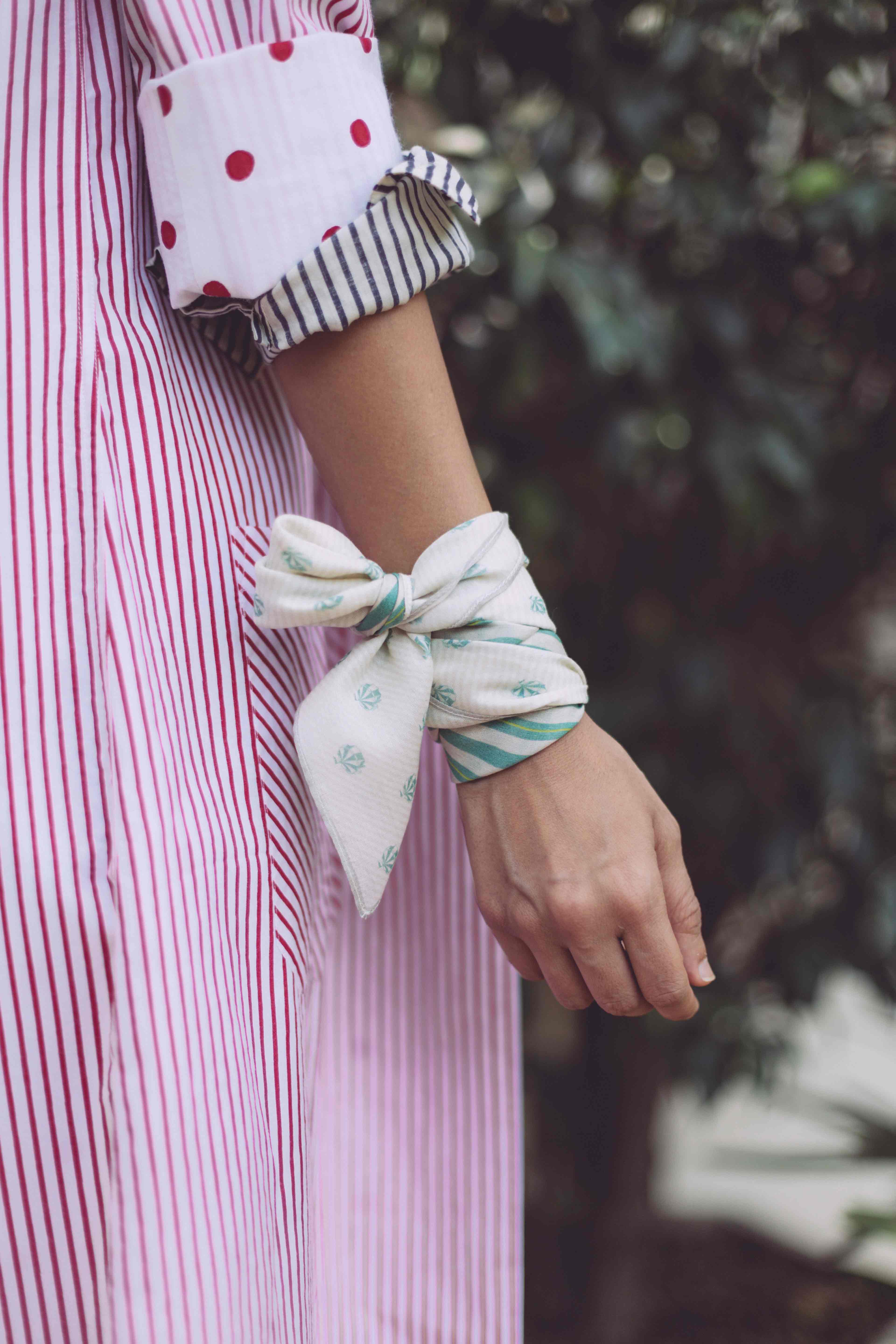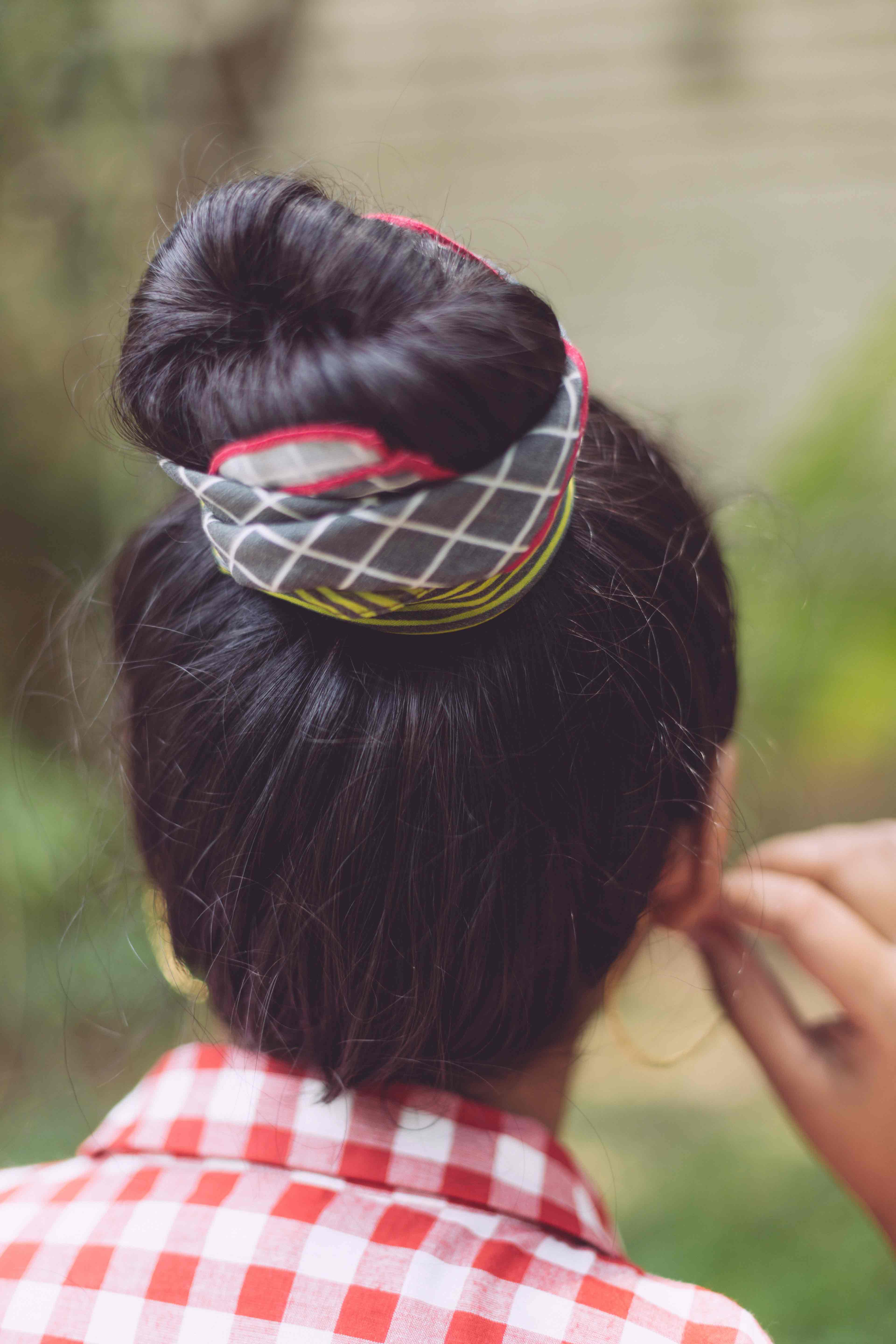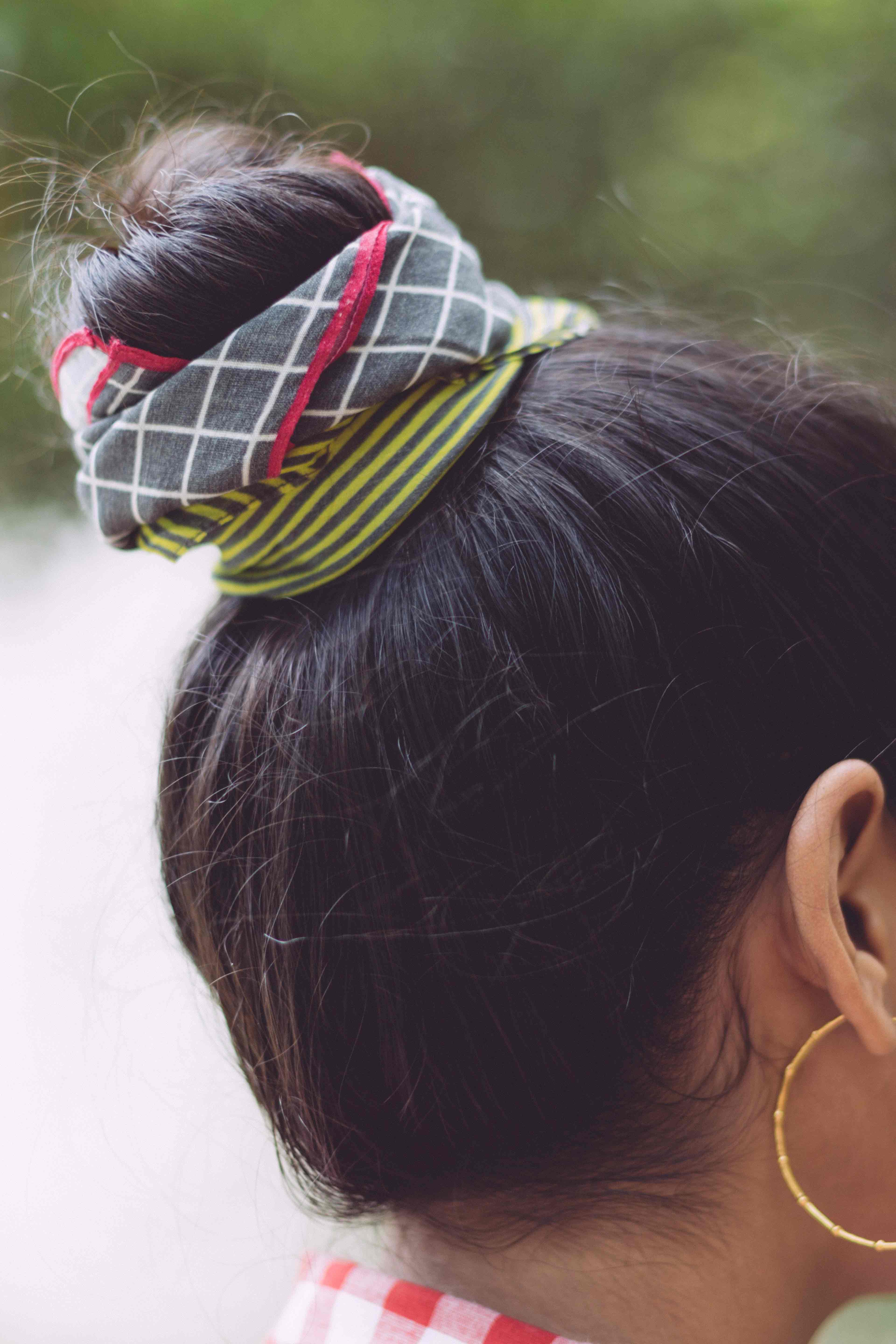 Wrap it around a top-knot if your hair’s long, a tighter wrap for a slick ponytail in shorter hair, and a ’50s knot for a pixie crop.